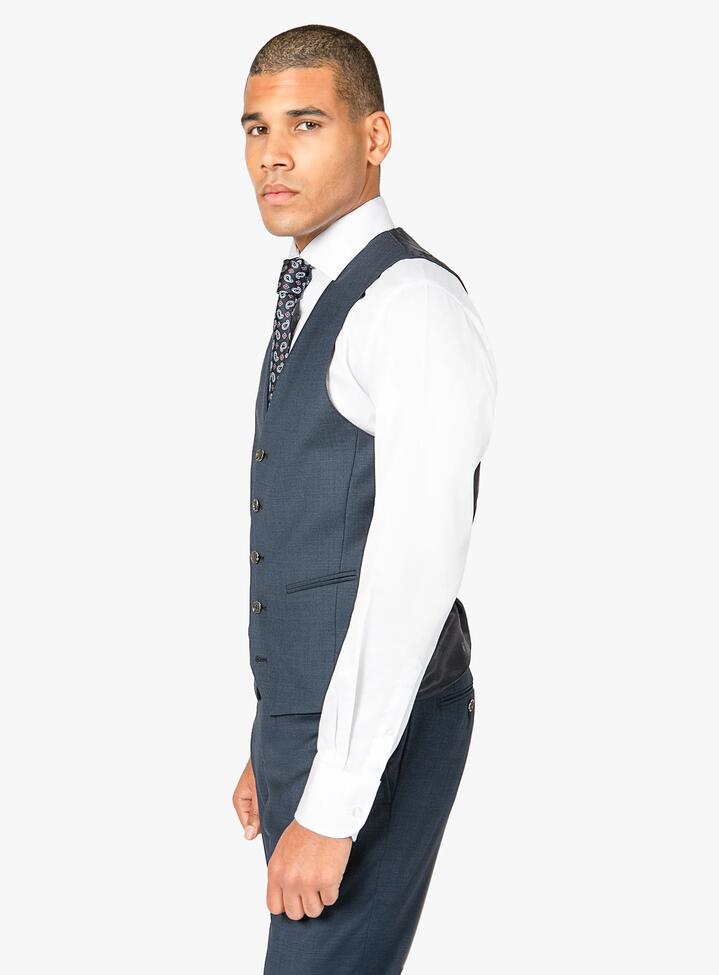 A new take on the darker summer blue tones, in a subtle birdseye pattern. Whether being used as a complementary piece or a statement garment, our Cayman cut is a slim and neat profile that flatters whichever shape it moulds. With a single-breasted 5-button design and an adjustable waistband on the back for a perfectly stylish fit. Wear it with: Brad Navy Blue Birdseye Jacket (SSRC20) and Dexter Navy Blue Birdseye Trousers (SSRT20)